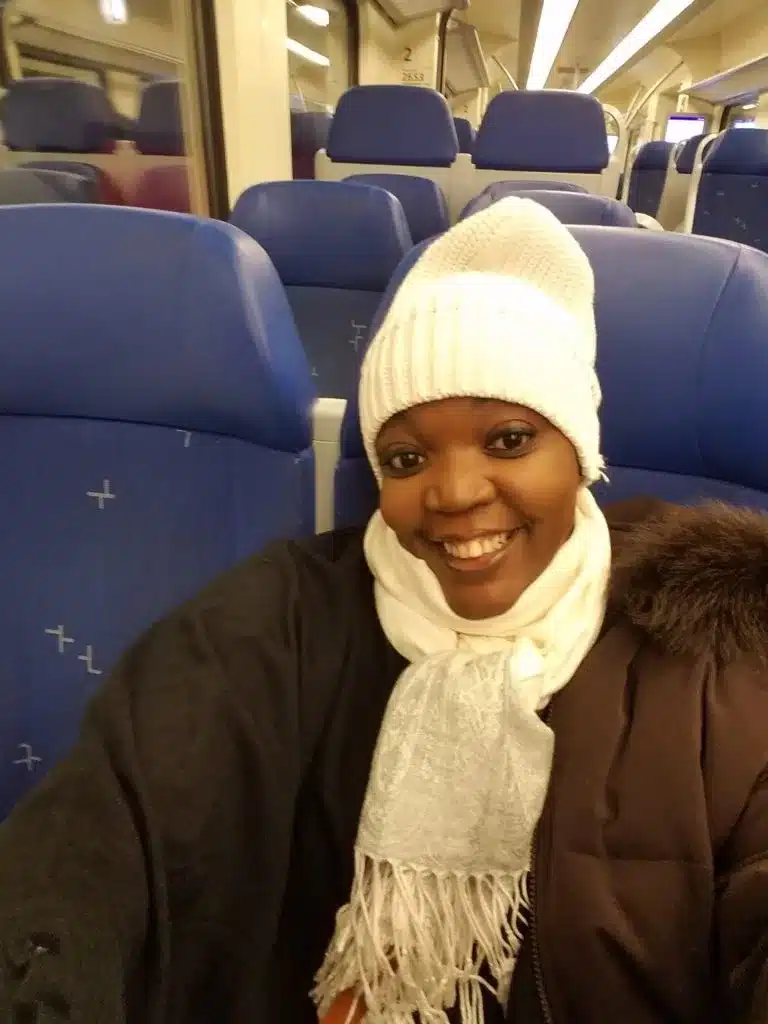 When I arrived at the station, a train was approaching and without reading the route, I got on.  The train made a stop at the Amsterdam Airport station which was one of the stops on the route to Haarlem station. Well, pretty much everyone exited the train and I stayed on. While I was sitting there waiting for the train to depart, I decided to take a selfie (okay is more than one selfie — this one just made the cut – lol)